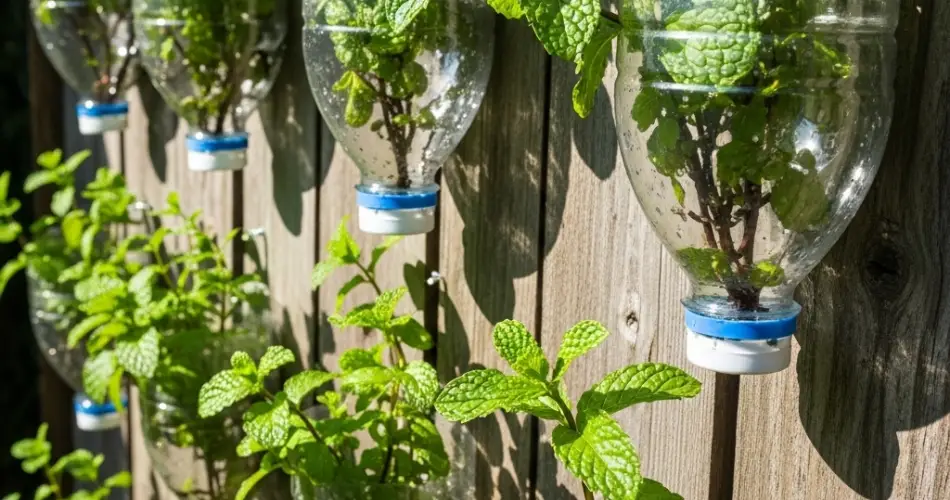 Attach the bottles to a wall, fence, or balcony railing using screws, nails, or hooks. Position them slightly tilted forward so water reaches the roots evenly without spilling. A vertical arrangement allows you to grow multiple mint plants in a small space, while staggering the bottles can create an attractive visual pattern.