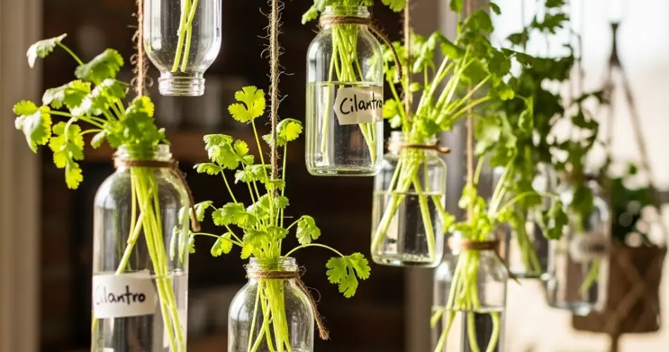 Indoor Herb Garden: Hang bottle planters near kitchen windows or under grow lights to enjoy fresh cilantro year-round indoors.