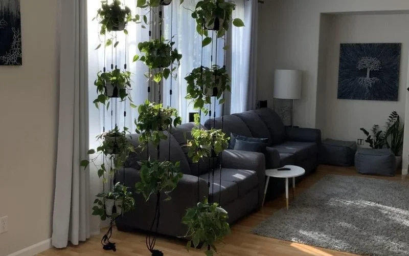 1. Plant Curtain: If you have a not-so-spacious home and need to divide spaces, you can create a curtain with plants using a metal rod fixed to the ceiling. During the execution of this project, pay close attention to the weight of each pot, which should be tied to the support with thin black rope and plastic hooks. The plants used to create this curtain are of the trailing type.