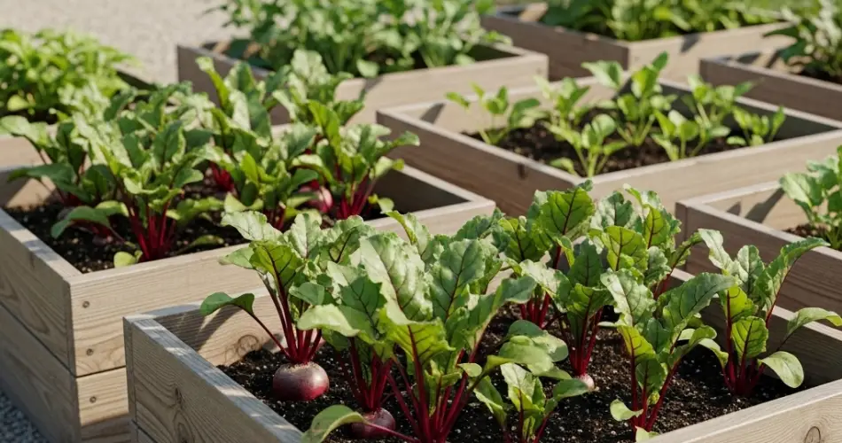 Growing red beets in rustic wooden containers comes with many advantages: