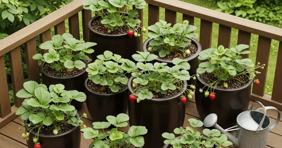 Strawberries need at least 6–8 hours of direct sunlight daily. Place your pots in a sunny spot—ideally south-facing if you’re in the northern hemisphere.