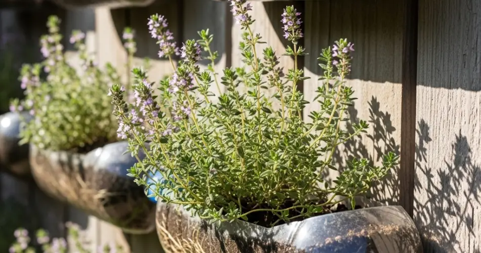 Using plastic bottles as planters is an eco-conscious choice. Bottles are lightweight, durable, and easy to modify for planting. They can be arranged in rows or staggered vertically, creating an attractive and functional herb wall. Thyme thrives in well-draining soil and requires moderate sunlight, both of which are easy to manage in a vertical setup.