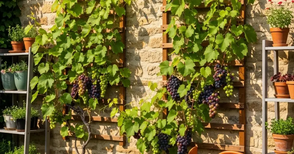 Using vertical trellises also allows gardeners to create an aesthetically pleasing backdrop or focal point, transforming plain walls into lush, green vineyard-style displays. Whether for a home garden, patio, or balcony, vertical trellises make grape cultivation practical, productive, and visually appealing.