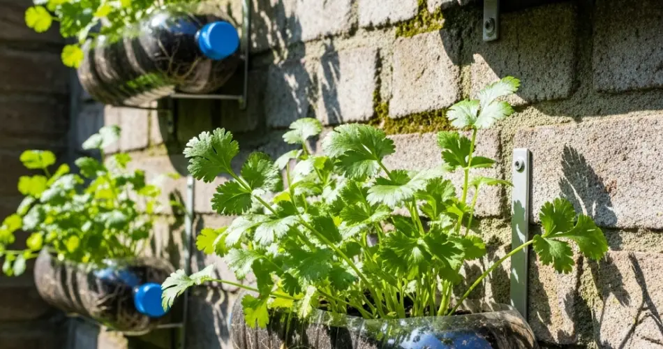A bottle wall garden offers both visual appeal and practicality. The greenery brightens walls, adds texture, and creates a natural focal point for any space. Repurposing plastic bottles reduces waste while creating a functional herb-growing system. Having fresh cilantro within reach improves culinary creativity and provides the satisfaction of homegrown produce.