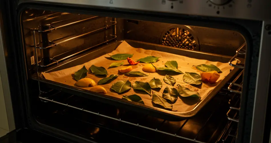 During this process, the leaves will release their natural essential oils. These oils have a powerful aroma that neutralizes unwanted odors, including those caused by burnt food. After just a few minutes in the oven, the scent will fill the kitchen and can linger throughout your home for days, leaving a refreshing and natural citrus fragrance.