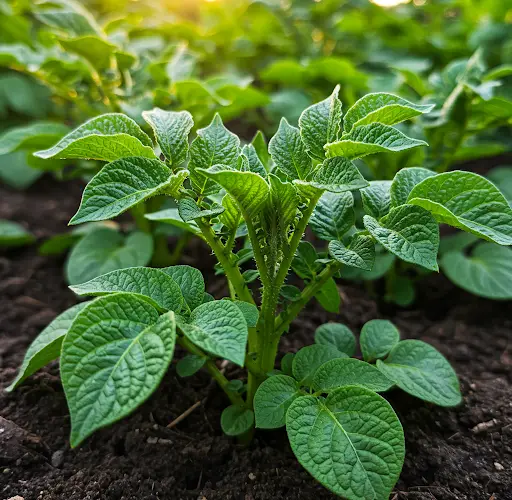 - Flowers appear, indicating early-stage potato development.